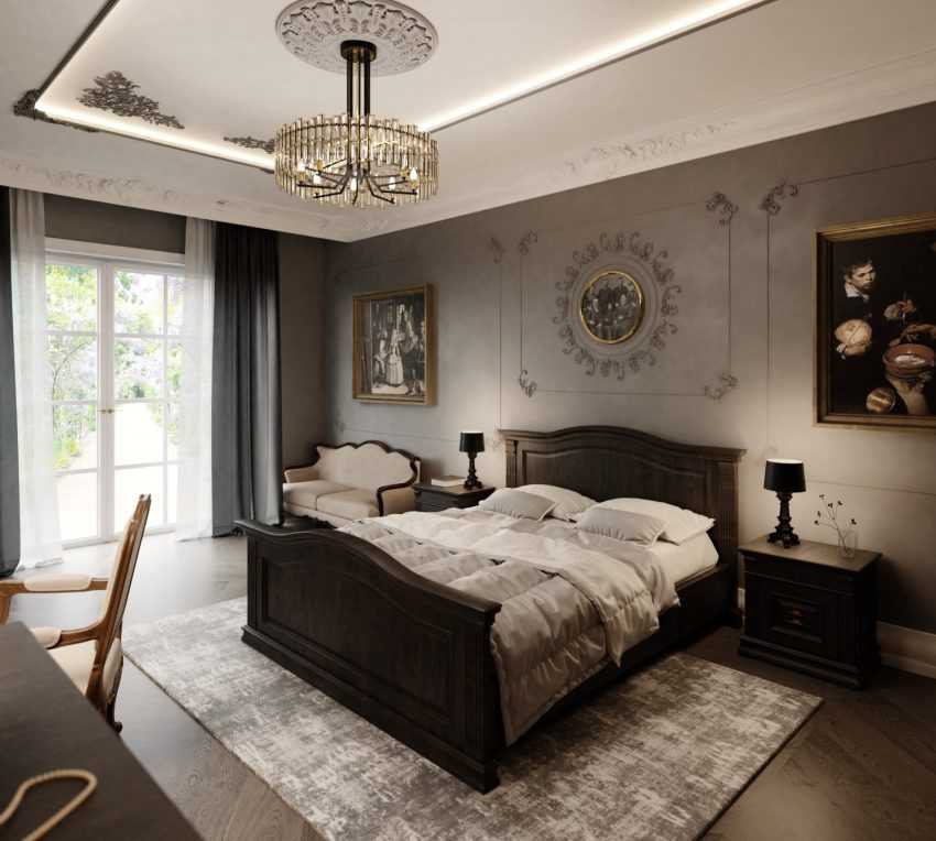 Классическая спальня имеет характерные элементы декора, по которым описываемый стиль легко читается. Без использования этих деталей интерьер не будет иметь законченный вид.