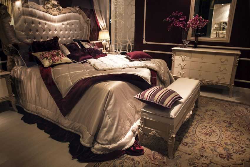 Центральное место, конечно же, занимает кровать с массивным резным изголовьем, светлой кожаной или бархатной обивкой. Иногда ее могут украшать кованые детали, позолота.