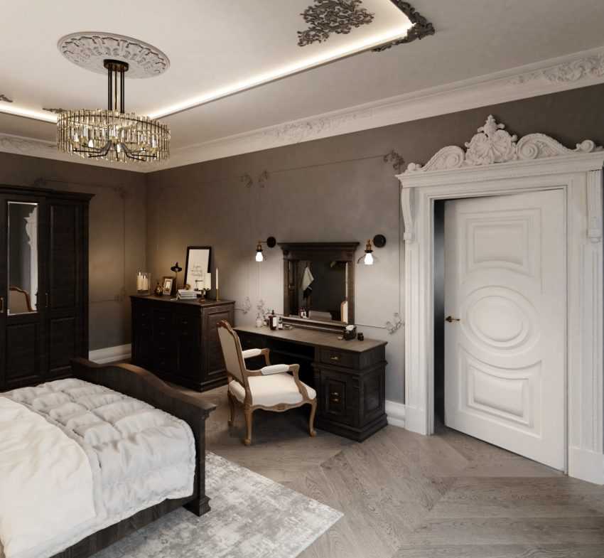 В спальне для женщин преобладают светлые и тёплые оттенки. Обязательно наличие зеркал и туалетного столика. Лепнина и объёмные молдинги придадут комнате романтизма и торжественности.