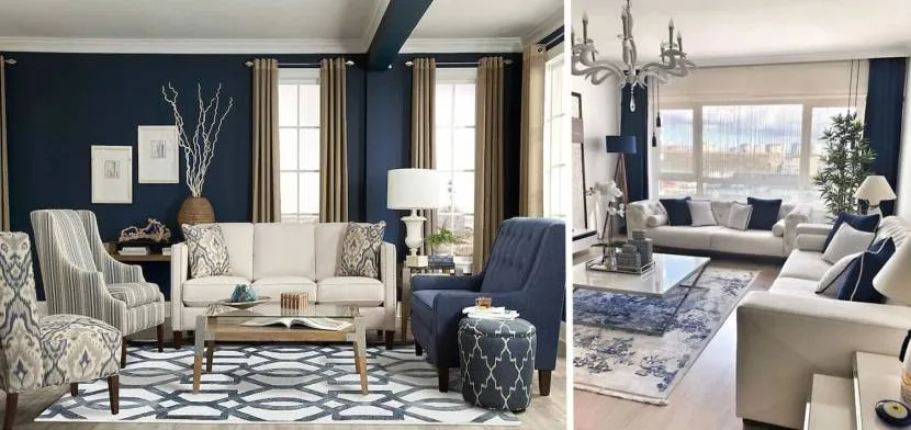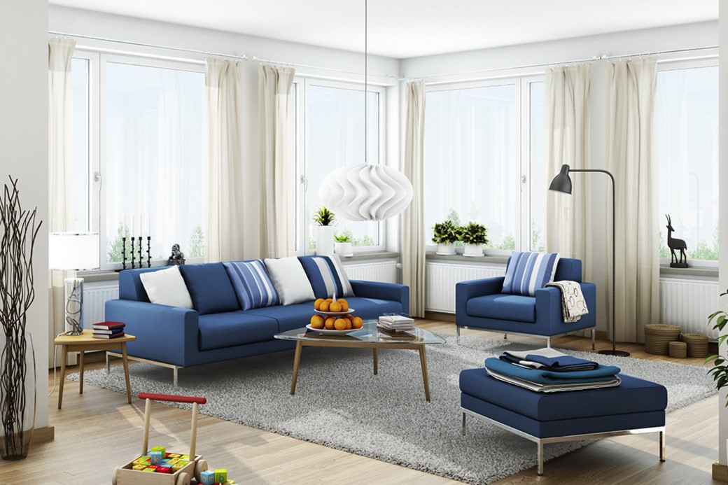 Синий диван и кресло являются оригинальным интерьерным акцентом в светлой гостиной
