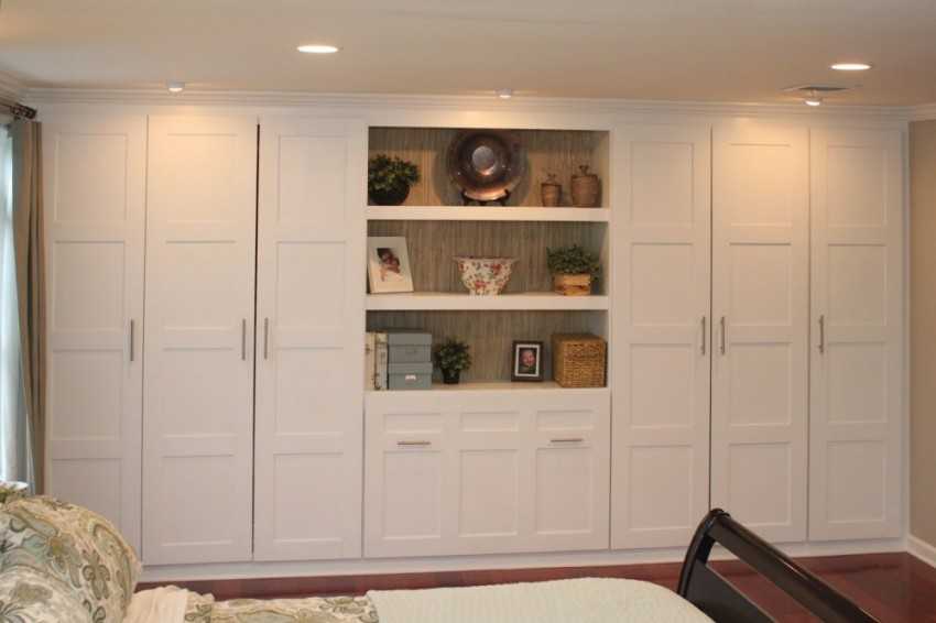 В закрытых шкафах проблемы с количеством вещей не возникнет, ведь за фасадами можно спрятать многое. Чтобы конструкция не выглядела громадной, выбирайте шкаф в тон мебели.