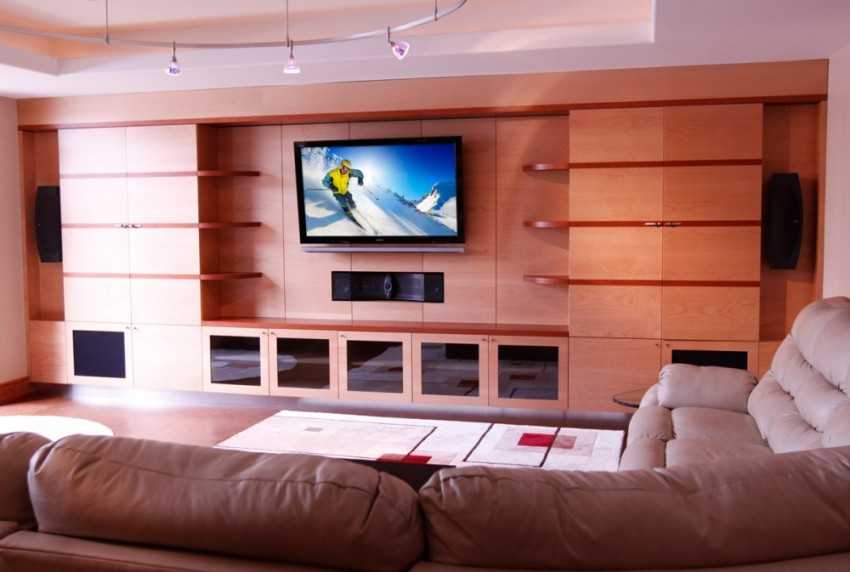 Что касается расстояния между телевизором и креслами, то оно рассчитывается, исходя из размеров экрана. Оптимальным вариантом станет расстояние в 3-5 диагоналей ТВ-устройства.