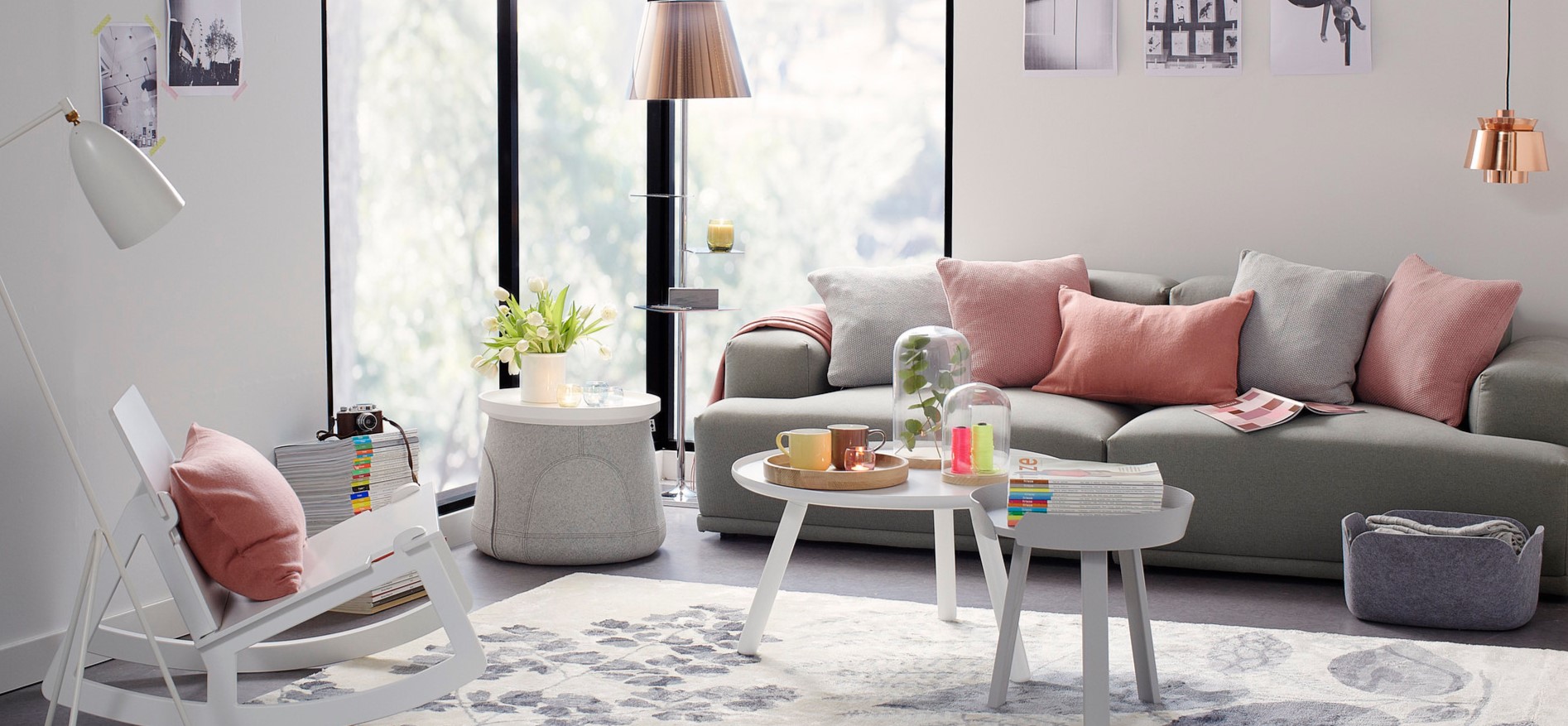 Диван со светло-серой обивкой можно дополнить розовыми подушками