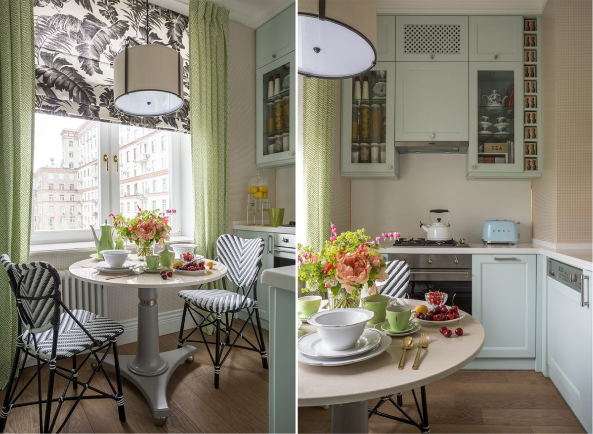 Если же площадь комнаты не позволяет организовать столовую зону в полном размере, то можно заменить стол барной стойкой и парочкой лаконичных стульев.