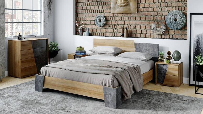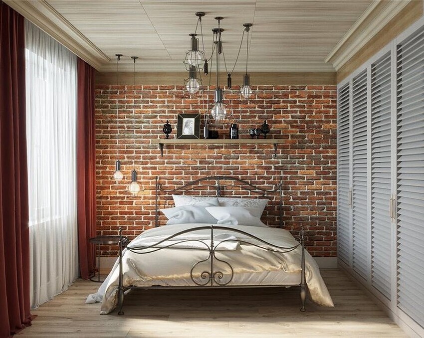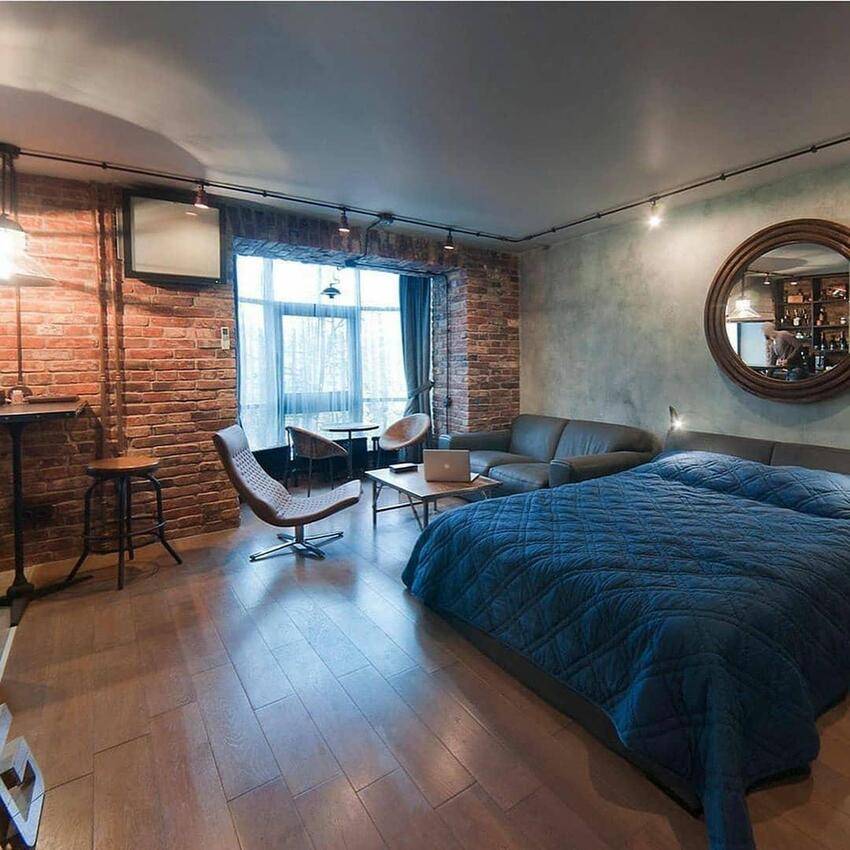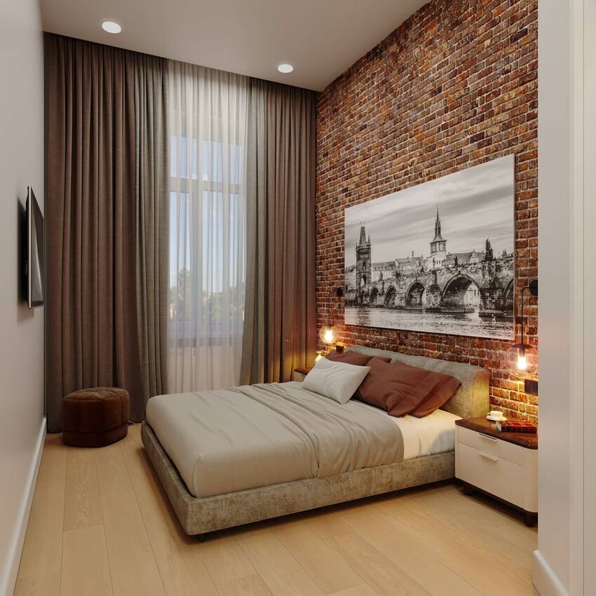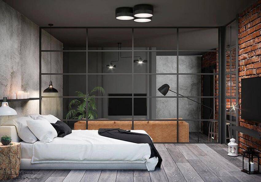 В спальне в стиле лофт важно сочетать практичность с удобством и функциональностью. Часто устанавливают только одну большую кровать по центру стены