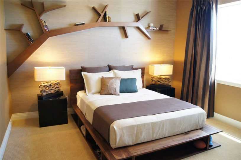Для хранения вещей в спальне можно использовать угловые полочки — они изменят конфигурацию комнаты, оборудовать ниши в стене.
