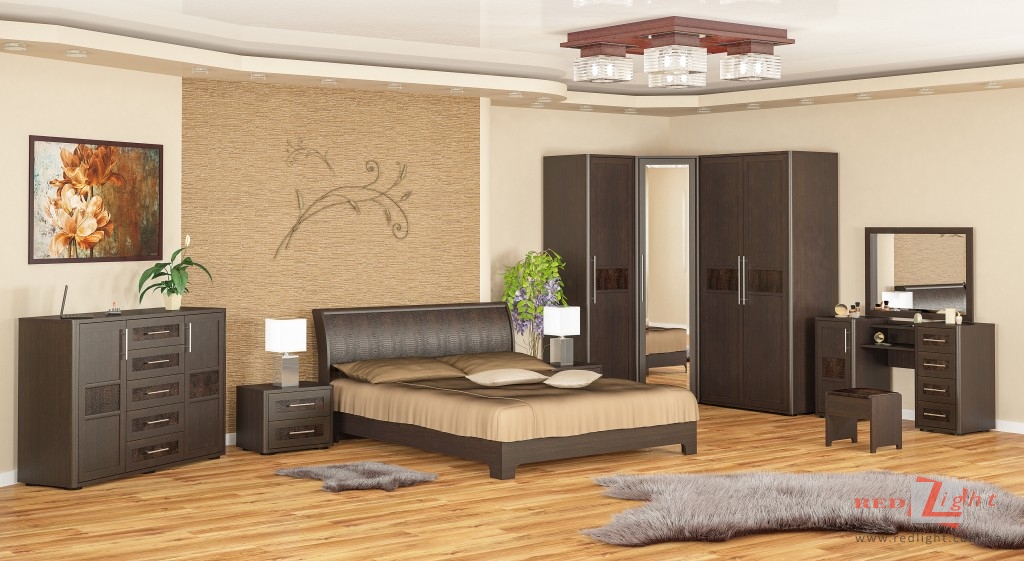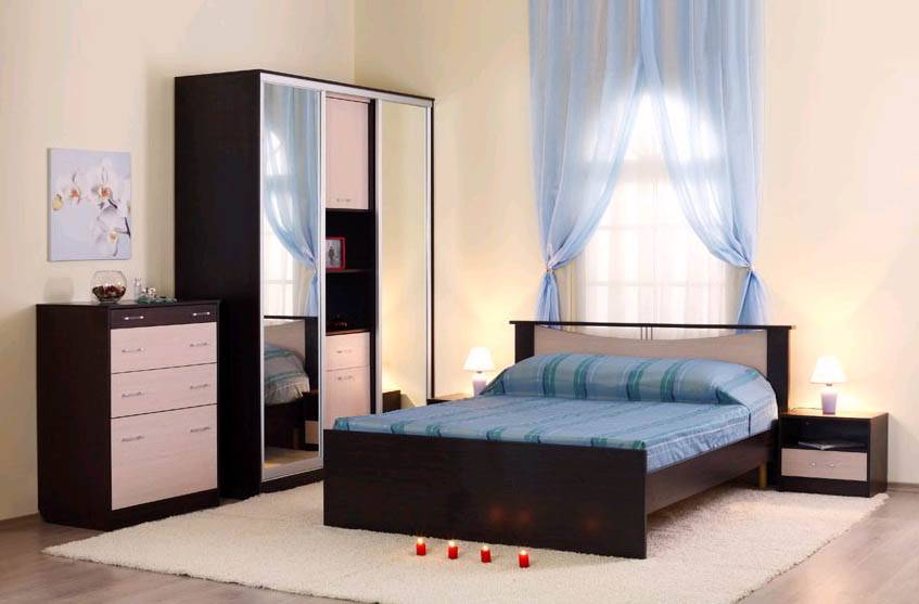 цвет мебели — этому критерию стоит выделить особое место в планировании. Расцветки изделий должны гармонировать с отделкой комнаты. Например, к светлым обоям подойдет гарнитур серого или бежевого цвета. При наличии яркой отделки, также отдайте выбор в пользу неброских изделий. Если спальня отделана в темных решениях, приобретайте мебель в контрасте или подходящую по оттенкам;