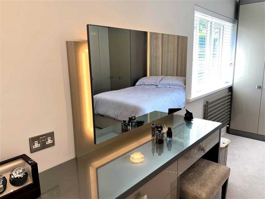 Зеркальная дверце шкафа расположена сбоку от кровати
