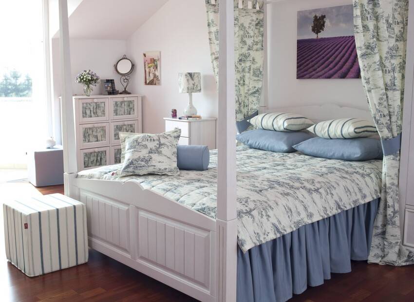 Спальня в стиле прованс — место, где обитают романтика и нежность. Отличительные черты — теплые пастельные оттенки, цветочные орнаменты, натуральные отделочные материалы, старинная или состаренная мебель, большое количество декора.
