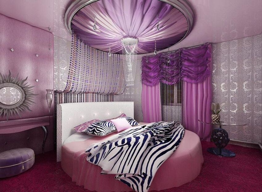 В гламурной спальне должна быть стильная мебель. Подойдет круглая кровать. Если спальное место стандартной формы, его украшают оригинальным изголовьем.
