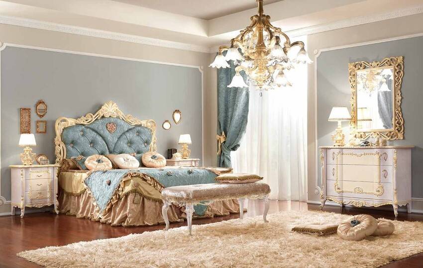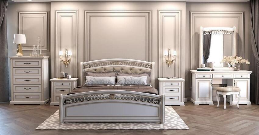 Красивую мебель в спальню изготавливают из дерева и стилизуют под старину. Искусственно создают сколы, потертости. В качестве дополнения к гарнитуру комнату украшают лепниной, картинами эпохи Ренессанса, фарфоровыми статуэтками.