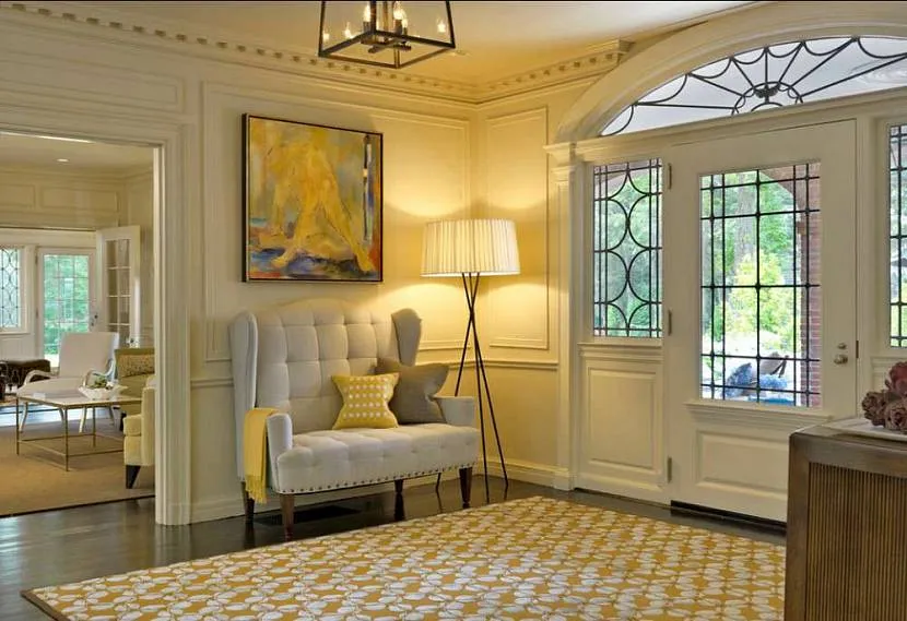 Если прихожая с гладкими стенами и достаточно просторна, в качестве декоративных элементов можно использовать молдинги, лепнину, фальшпанели. Подобный декор внесёт разнообразие, разбавив монотонный интерьер. Такая отделка подчеркнёт изысканность дизайна и лучше всего впишется в один из классических стилей.