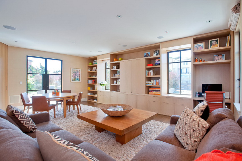 Стенка, оборудованная большим количеством полок, идеальна в просторных гостиных, решает проблему нагромождения предметов. Как правило, это модульная система. Подобные конструкции смотрятся на своем месте в современных интерьерах. Лаконичная мебель собирается из ДСП, МДФ и бывает как ярких, так и нейтральных оттенков.