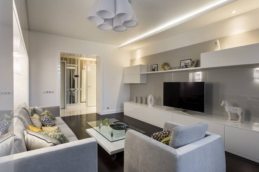 Стенки в стиле хай-тек оставляют максимум простора в гостиной