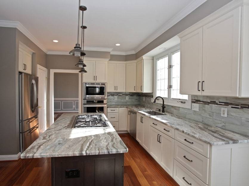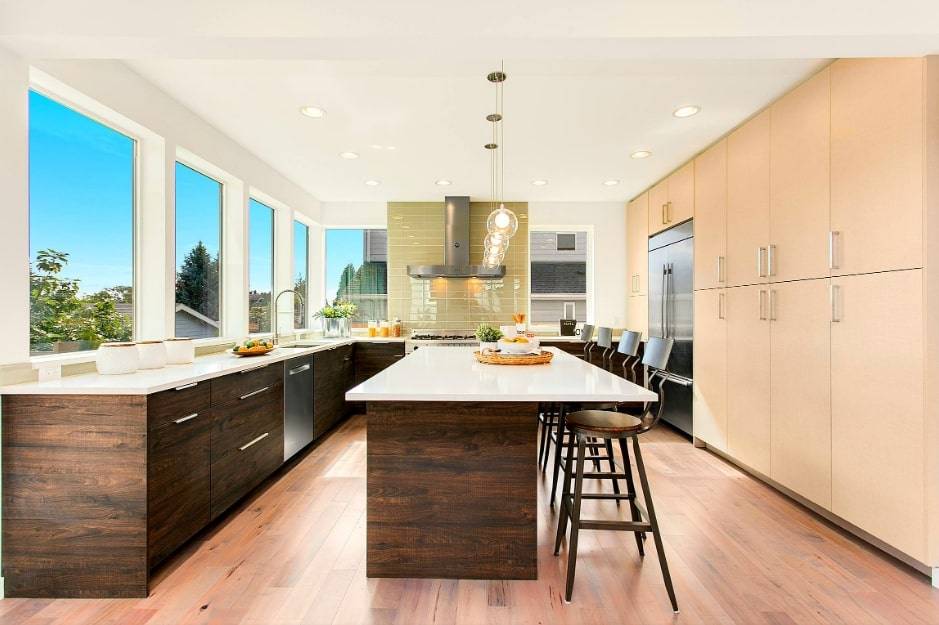 Очень эффектно выглядит двухцветная кухня с белыми шкафчиками по периметру. Ее можно украсить мраморной плиткой и кухонным островом шоколадно-коричневого цвета.