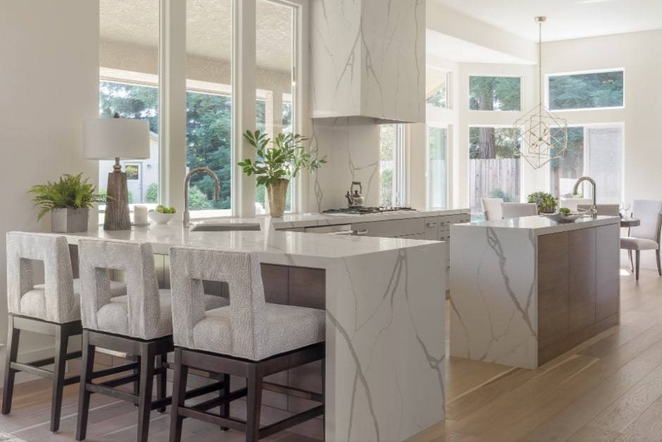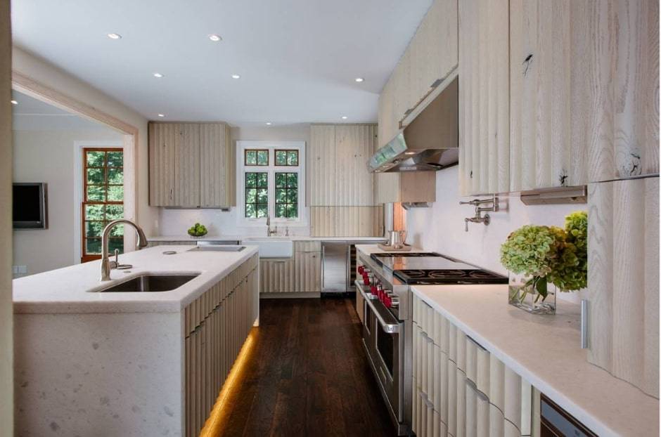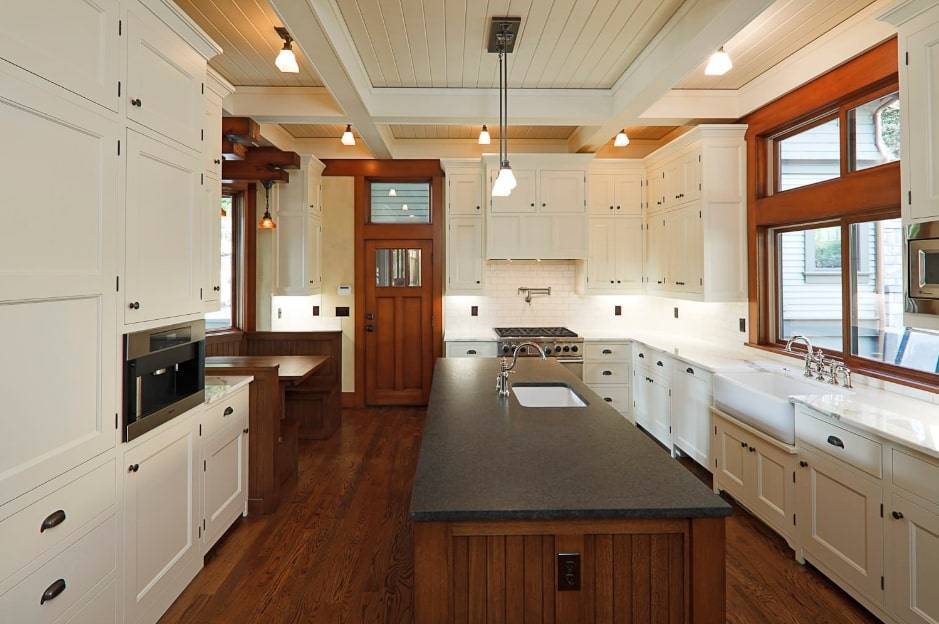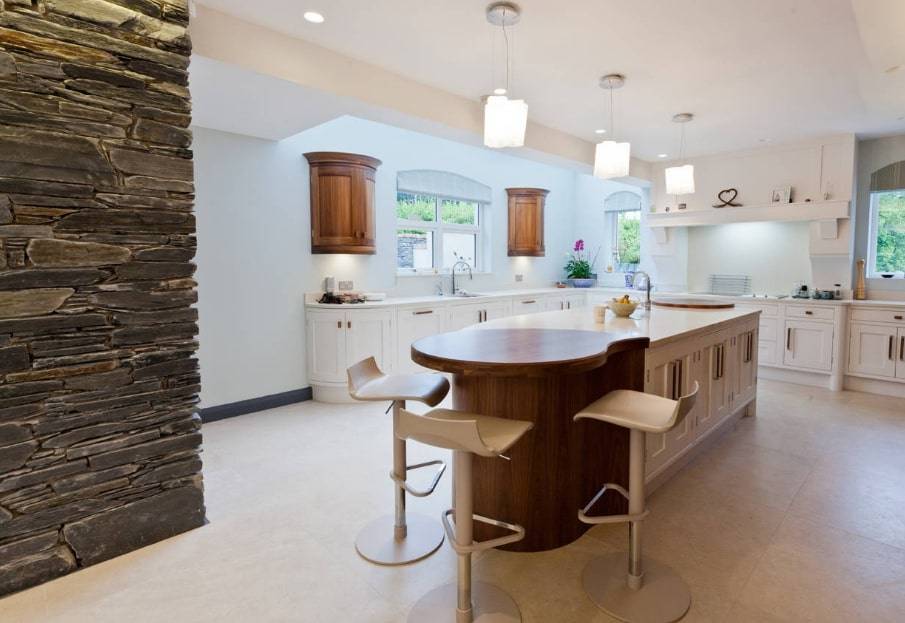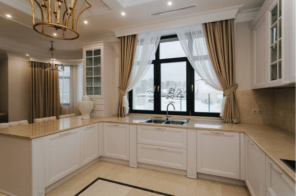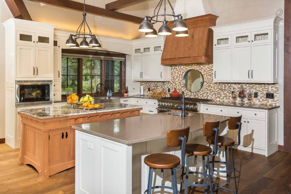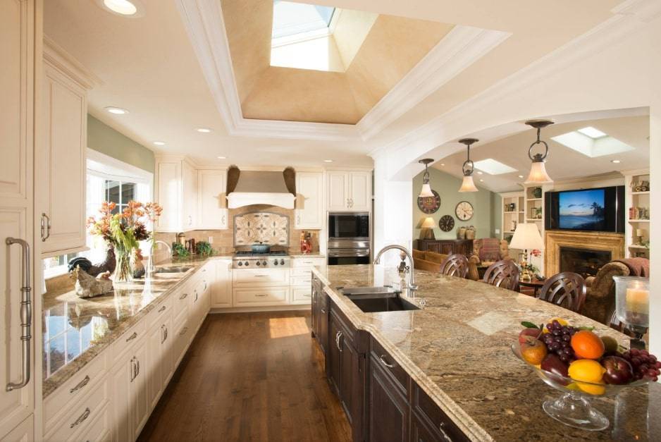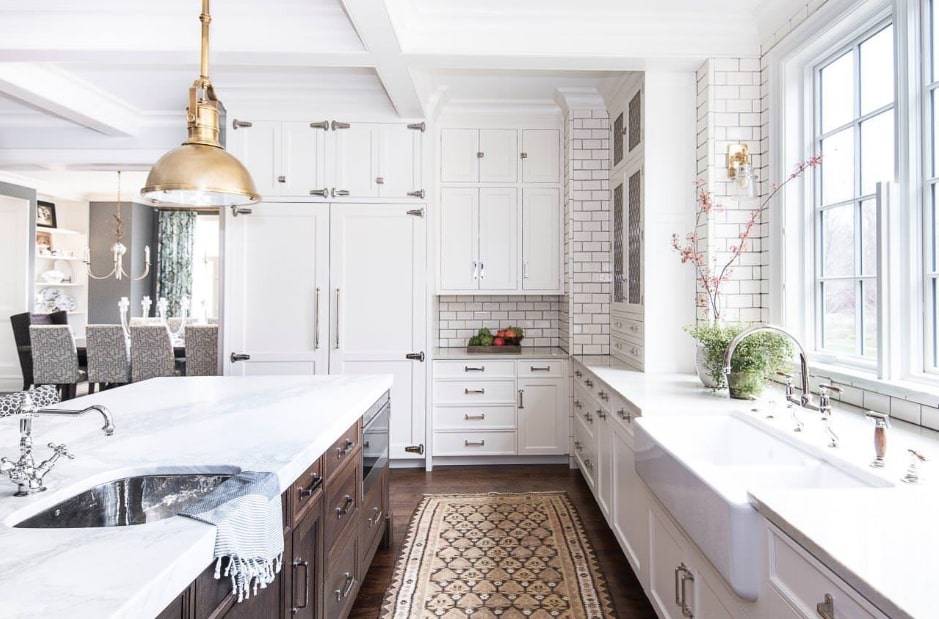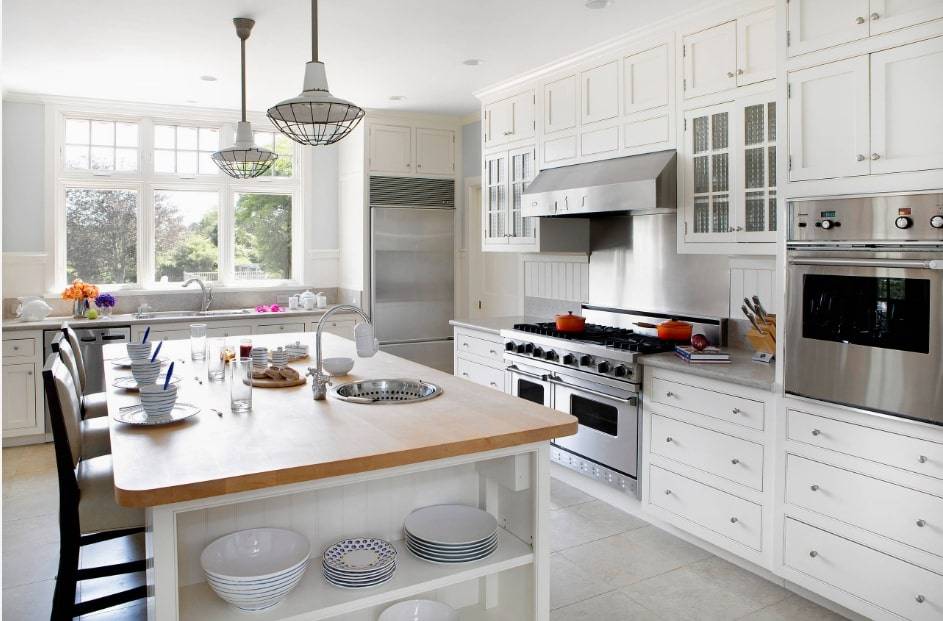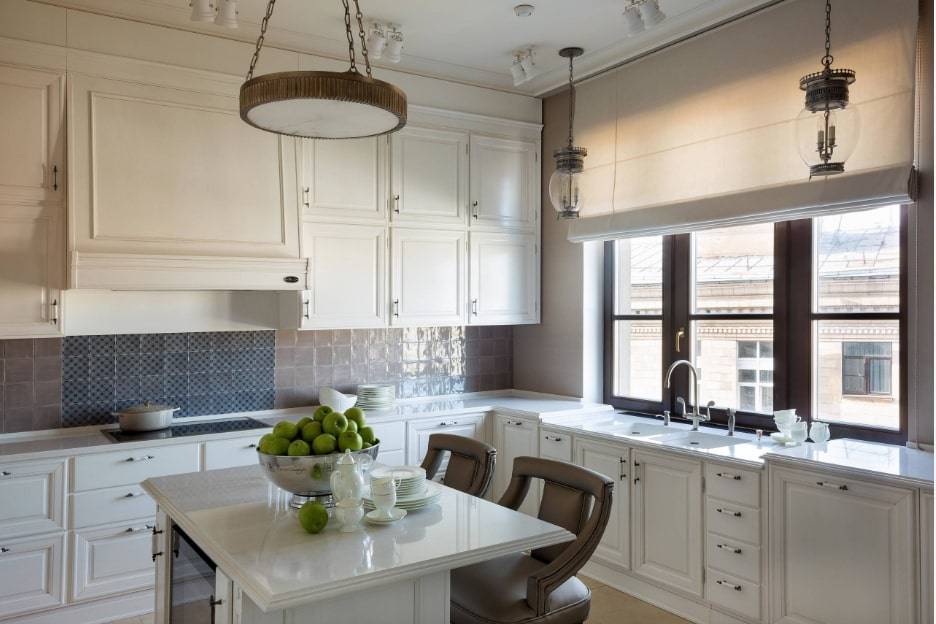 Площадь большого размера требует немалого внимания. Каждый элемент должен дополнять следующий. Традиционные кухни часто имеют классические элементы, такие как столешницы из белого мрамора, кессонный потолок. Хорошо смотрится белая кухня с бежевыми стенами и двумя островками.