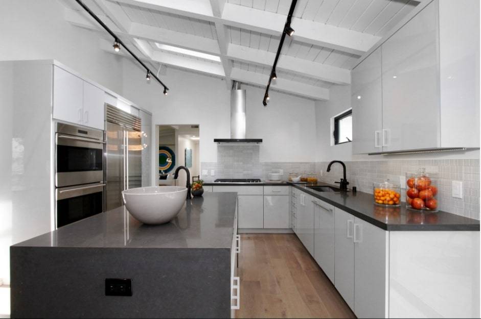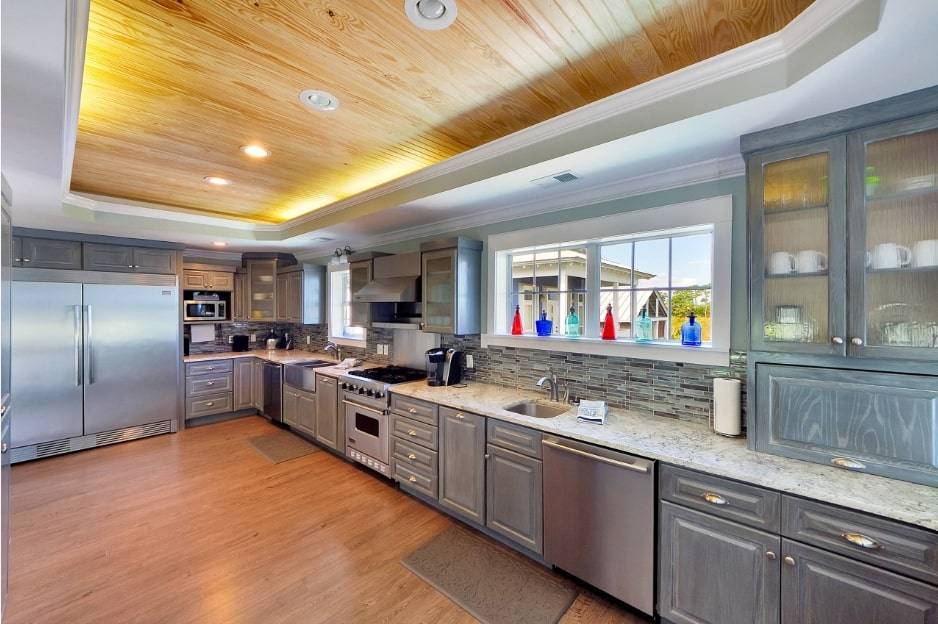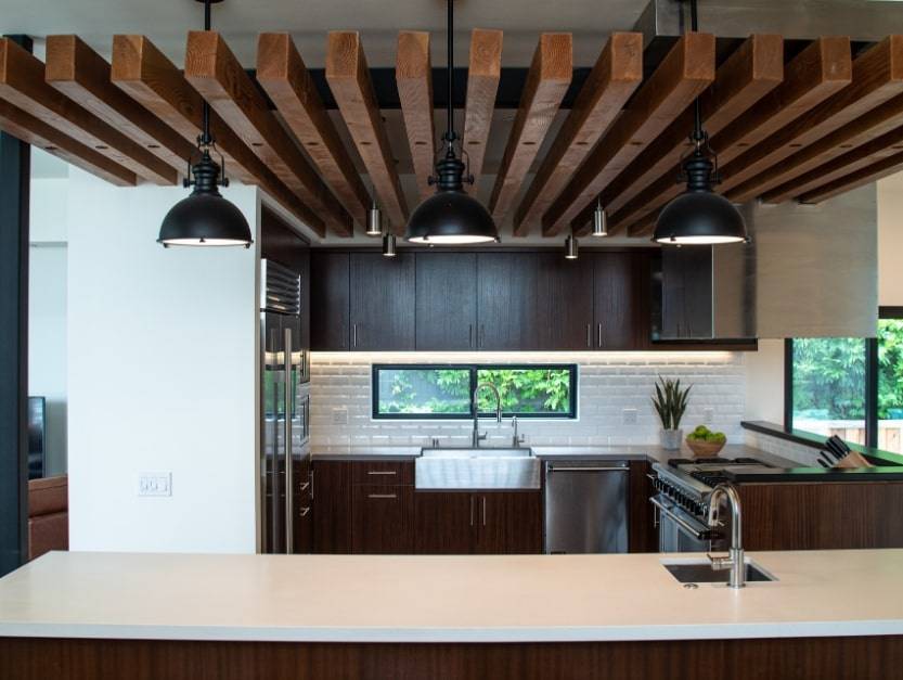 Современные кухни не должны быть резкими или холодными. В их интерьер лучше добавить естественных элементов, таких как деревянный потолок. Получится создать теплую обстановку в помещении.