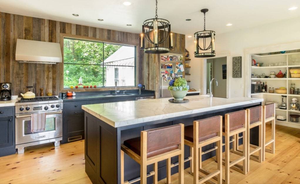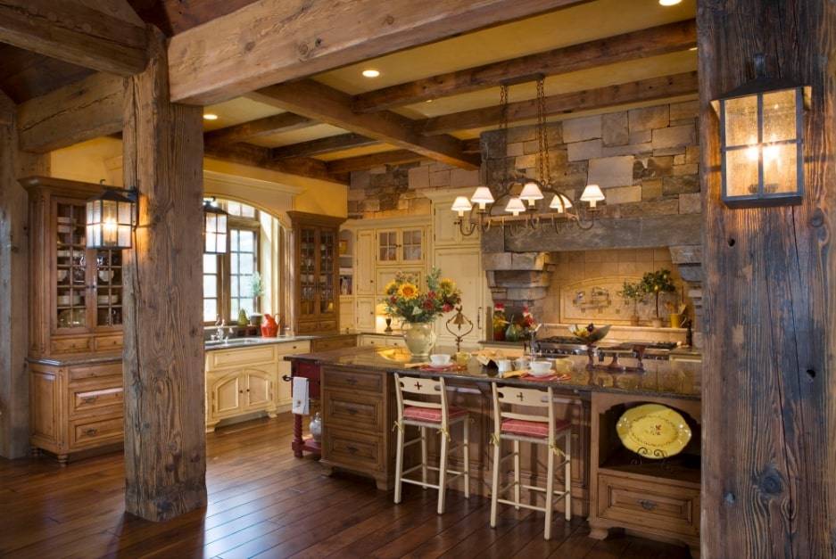 В тренде сейчас кухня в загородном стиле с деревянными балками и оцинкованной вытяжкой. В ней, как правило, используются кремово-белые шкафы и остров с большой мойкой. Французские интерьеры отличаются идеальным балансом между светлым цветом и черным. Стиль кантри при этом наполняет дом несравненной теплотой.