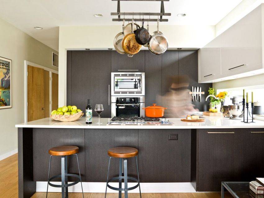 Подвесные рейлинговые системы крепятся к потолку. Конструкция изделий очень схожа с решеткой, на которой располагается множество держателей для кухонной утвари, в том числе бокалов, чашек и другой посуды. Это неотъемлемый элемент для кухни с барной стойкой или островом. Такой вариант расположения придает кухне дополнительный уют.