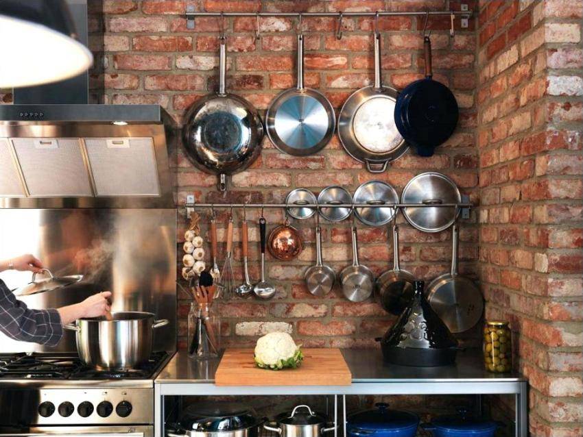 Подвесные системы рейлингов крепятся к потолку, благодаря чему могут выдержать вес тяжелых кастрюль и сковородок