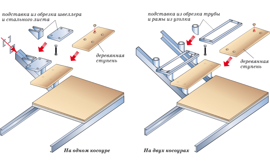 Опоры устанавливаются под углом к косоуру и составляют горизонтальную плоскость для крепления ступенек. Само крепление к балке – электросварка.