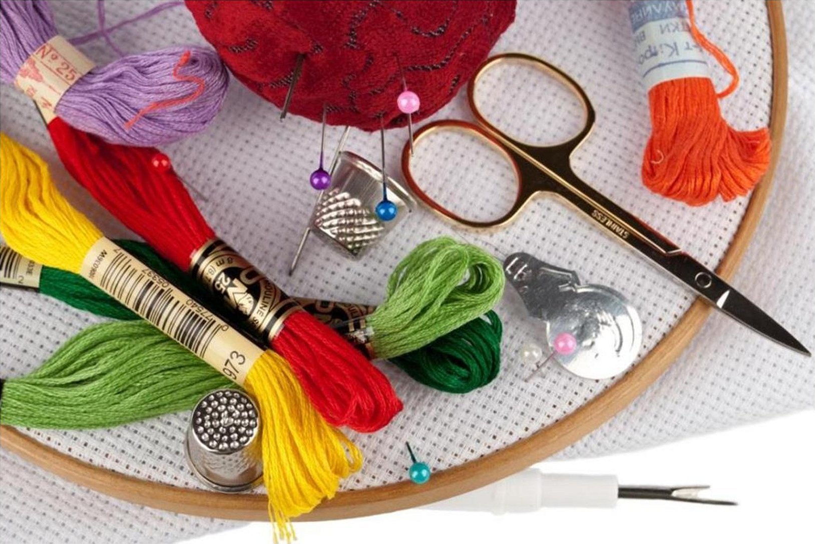 Стандартный набор инструментов для вышивания представлен иглой, нитями, пяльцами, канвой и наперстком.