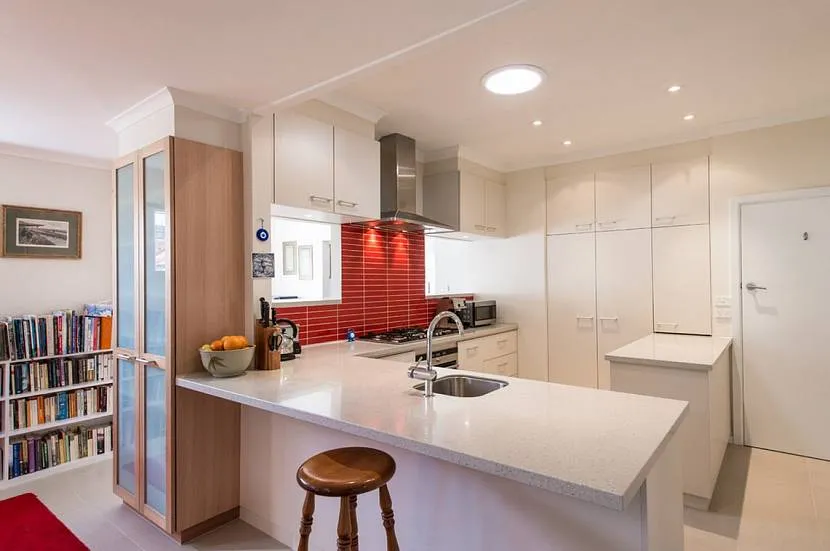 Встроенных вариантов также множество и все они по-своему удобны, но каждый проект зависит от планировки помещения. Например, стойка может соединяться со столешницей, образуя кухню П-образной формы. Это просто мечта хозяйки, когда все находится на расстоянии вытянутой руки или одного шага.
