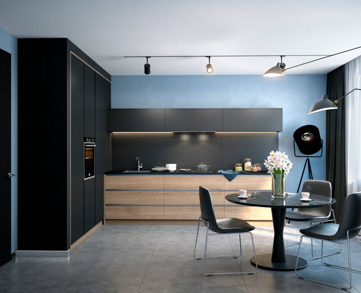 Можно выполнить кухню в полностью черных оттенках: глубокий угольно-черный, космический серый, цвет мокрого асфальта. Для того чтобы не создавать траурную атмосферу, разбавить стальными и/или деревянными вставками и большим количеством света.