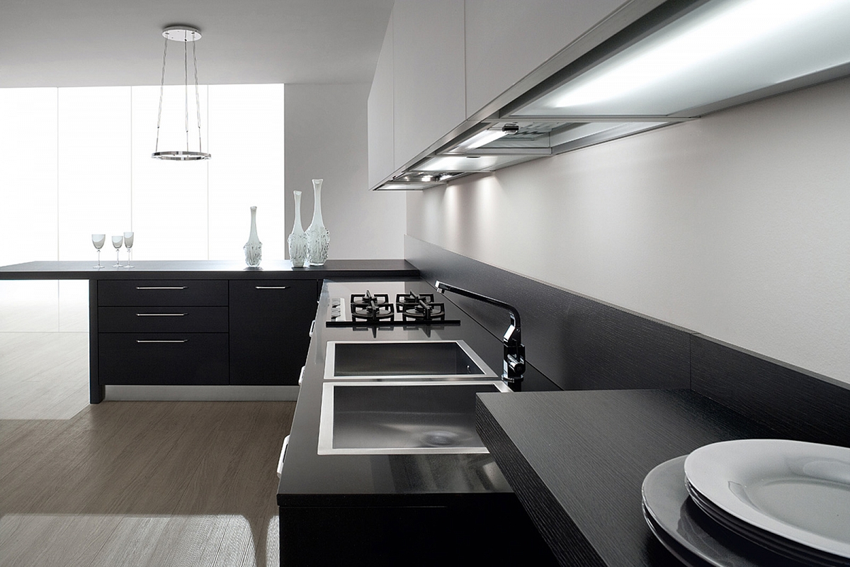 Для черной кухни в стиле минимализма лучше использовать материалы под камень, так черный будет выглядеть дороже.