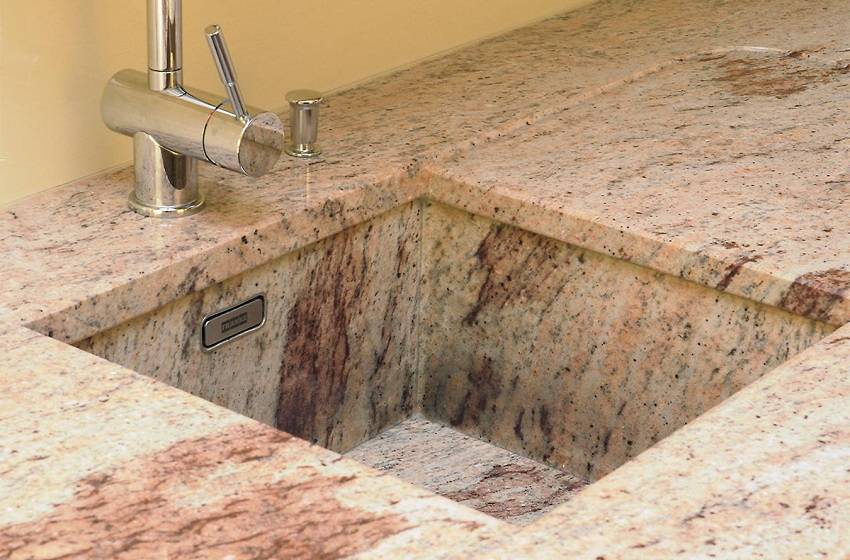 Другим популярным материалом для производства раковин является искусственный гранит. Его основу составляет мелкая гранитная крошка, связанная при помощи полимерной смолы. Чем больше в компаунде природного гранита, тем дороже изделия, изготовленные из него. Технология изготовления моек из синтетического гранита предусматривает заполнение форм в вакуумных камерах. При этом можно добиться идеальной гладкости поверхности и четкого соблюдения размеров.