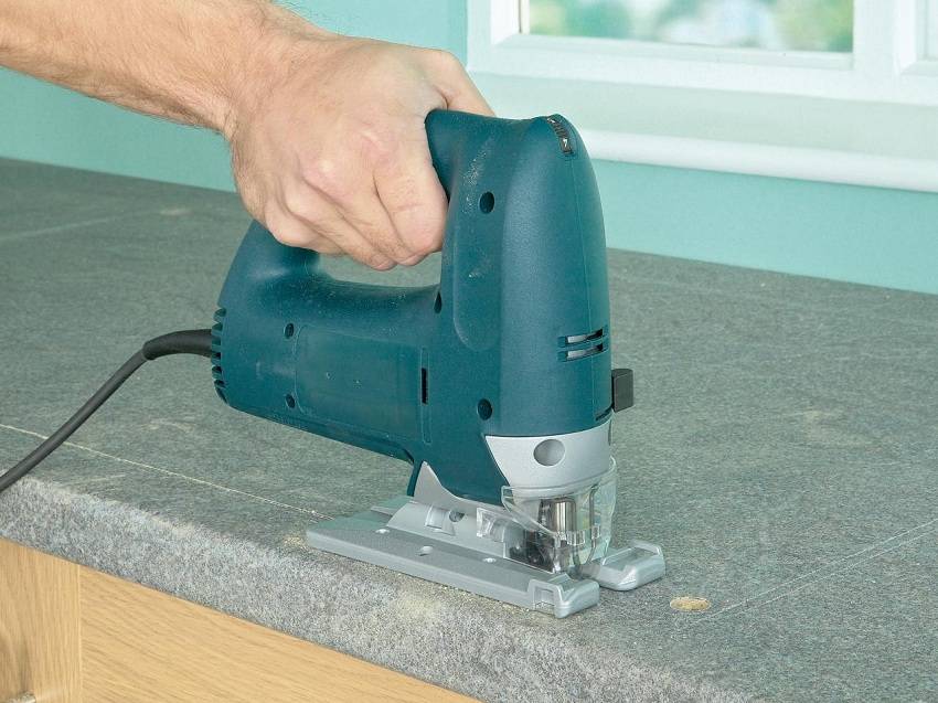 - электролобзиком вырезается контур. Для того, чтобы вырезать контур без особых трудностей, сначала высверлите в столешнице отверстие. После этого вставьте в него электролобзик и, приведите инструмент в действие;