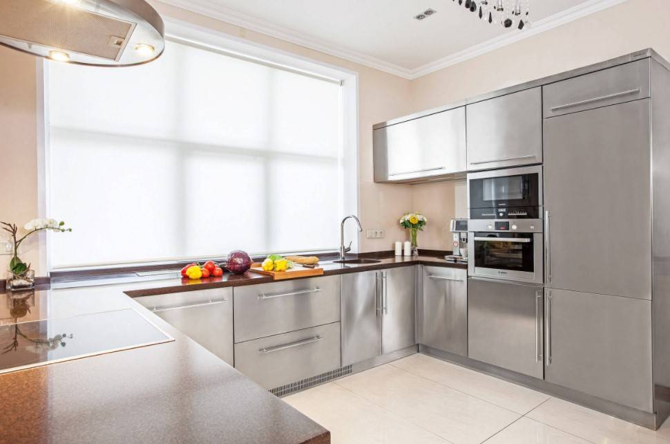 Хотите, чтобы в кухне-гостиной или студии кухня «растворилась» в пространстве? Закажите глухие ровные фасады гарнитура в тон отделки стен (светлые оттенки — лучший выбор).