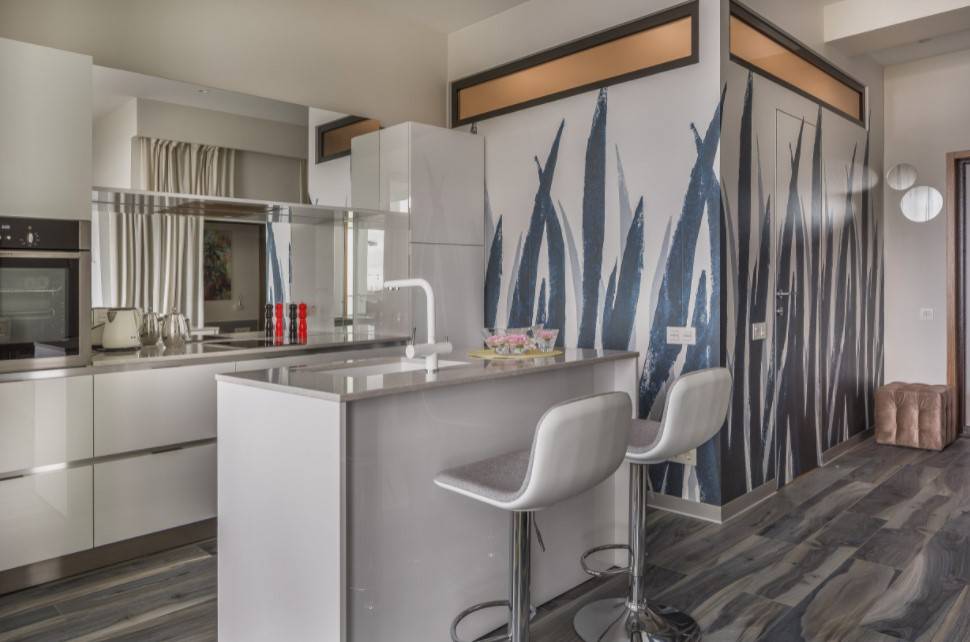 Если у вас квартира-студия с открытой планировкой или кухня-гостиная, и площадь позволяет, спланируйте прямой кухонный гарнитур с полуостровом (он требует меньше места) или островом. Обычно они служат рабочим столом или барной стойкой, и у вас появятся дополнительные шкафы для хранения.