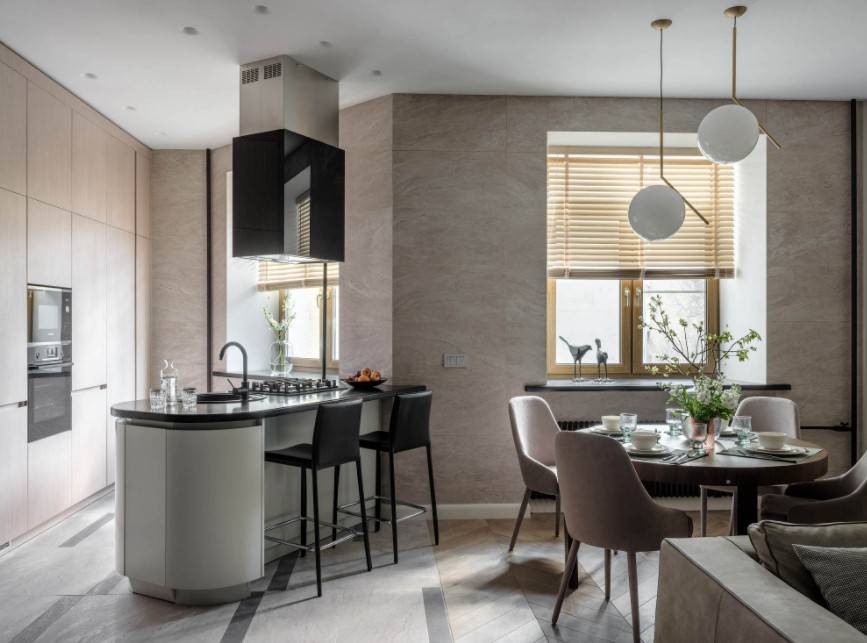 Остров и полуостров в кухне гостиной позволяют не только разделить объединенное помещение, но и увеличить его функционал.