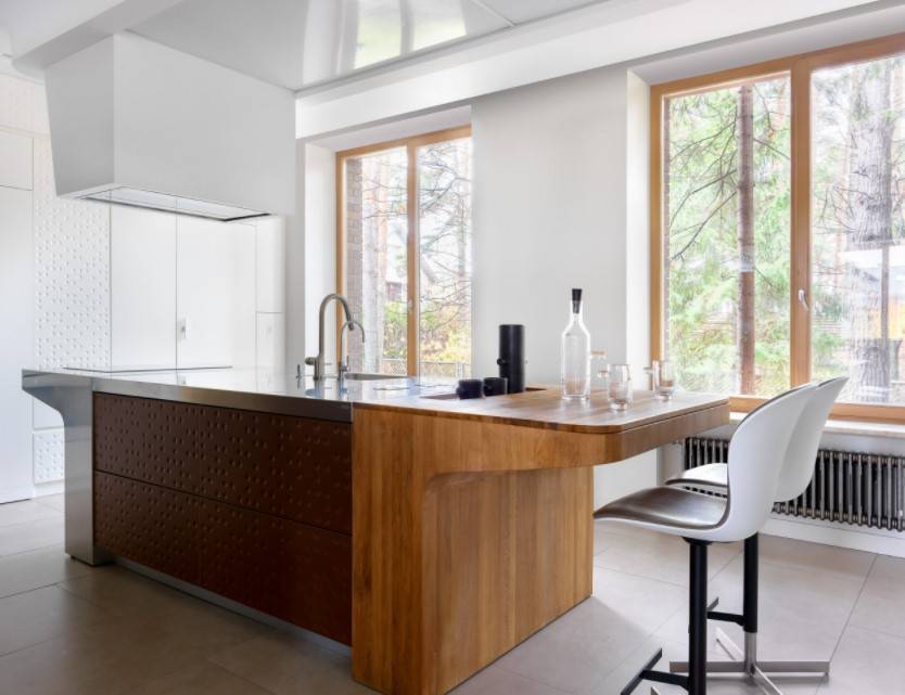 При этом, барная стойка может служить как самостоятельной обеденной зоной (для небольшой семьи), так и дополнительным местом для быстрых перекусов. Если место в кухне-гостиной или студии позволяет, то лучше установить и отдельную полноценную обеденную группу, например, для приема гостей.