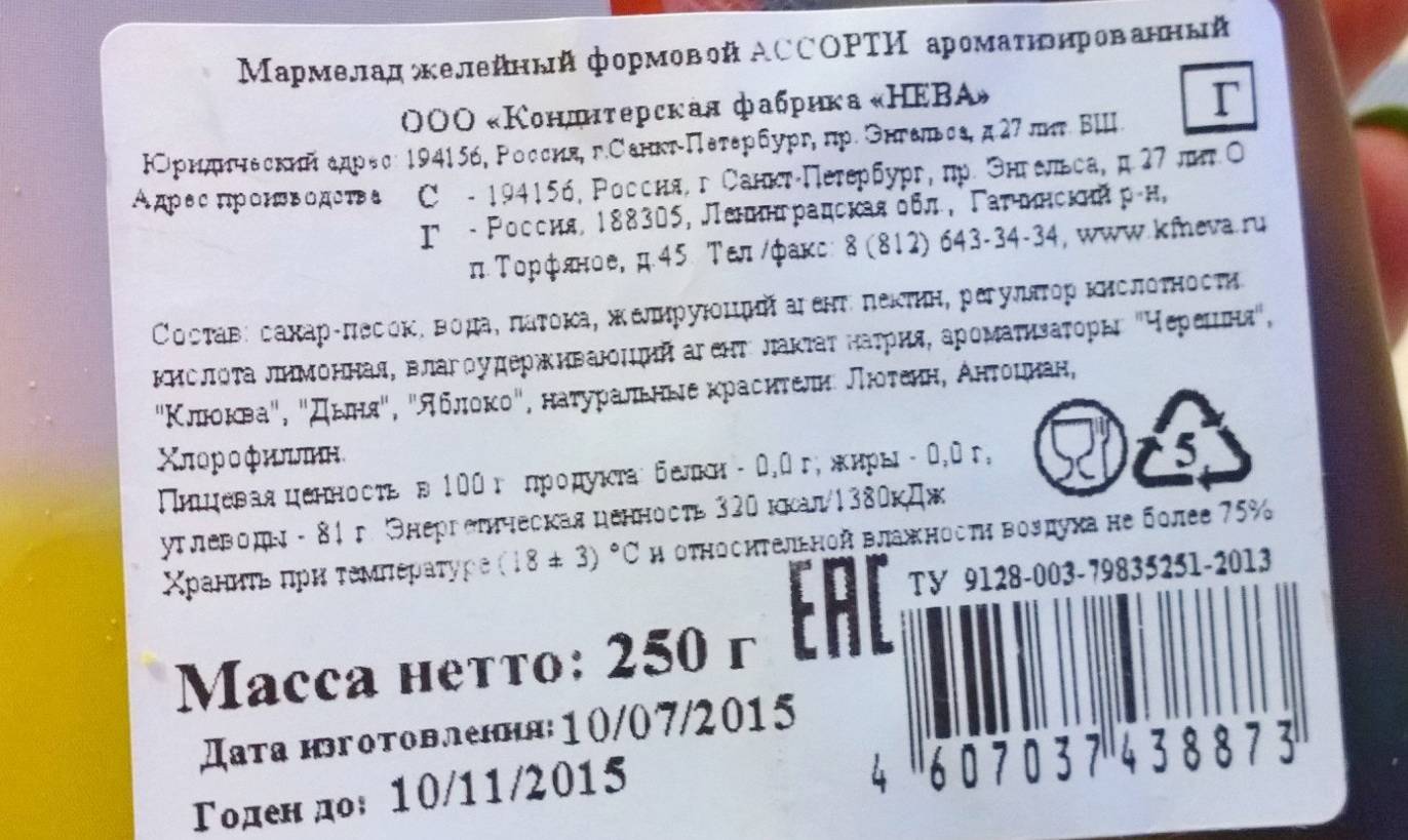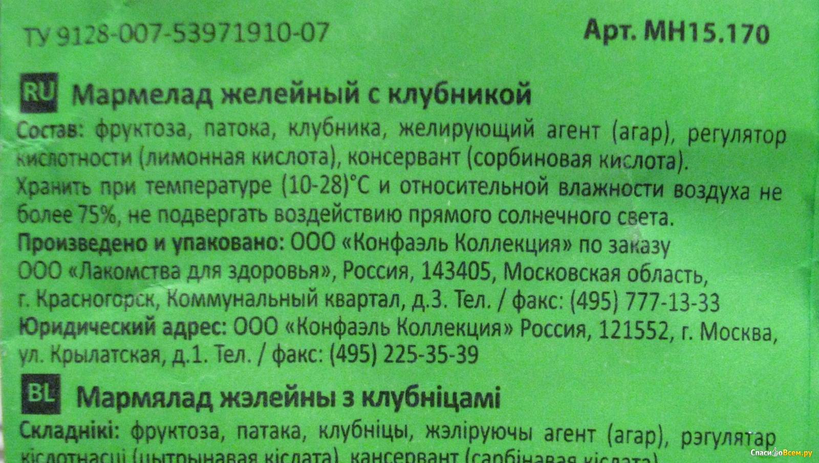 В составе дешевого, а значит не совсем качественного мармелада, помимо небольшого количества желирующего агента, всегда будет присутствовать какой-то консервант. В данном случае – это сорбиновая кислота. Консервант добавляется для увеличения срока годности продукции, что делает ее более конкурентоспособной на рынке.