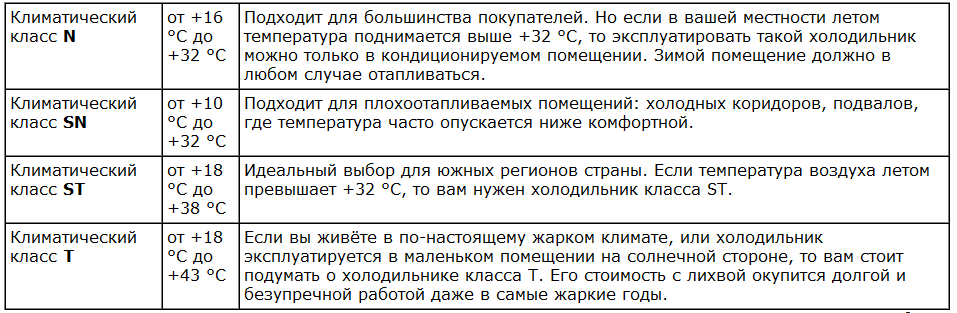 Паспортные данные на холодильную технику обязательно включают такой показатель как климатический класс. Эта норма указывает, при какой температуре окружающего воздуха холодильник может нормально функционировать. Соблюдение технических условий по правильной эксплуатации холодильных устройств, гарантирует отличную работу техники в температурном диапазоне от +16 до +32 °С, для отдельных моделей повышенной комфортности эти параметры составляют от +10 до +43 °С.