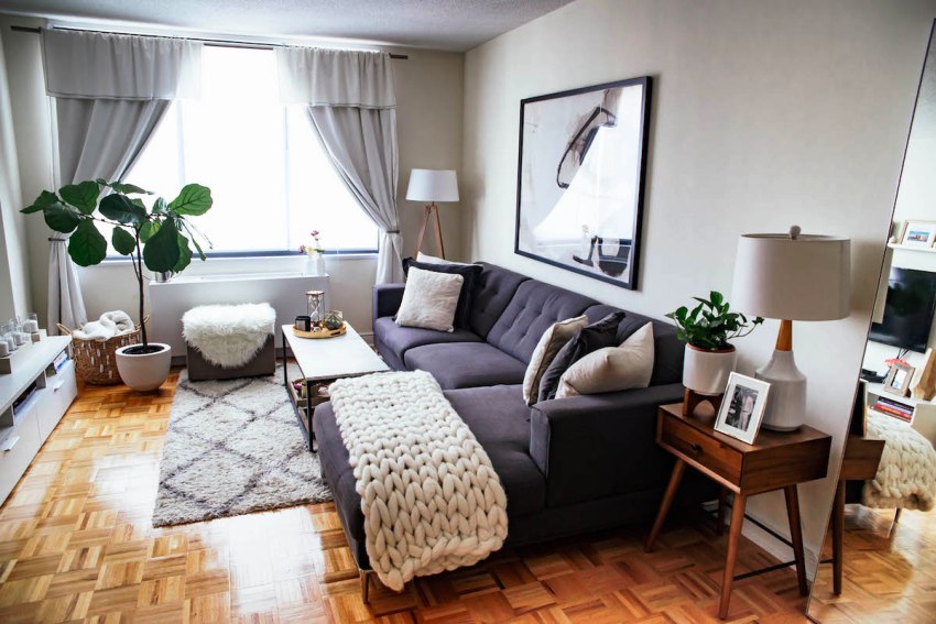Посмотрите на планировку своей гостиной. Бывает так, что нужно рационально использовать каждый уголок. В этом случае придется отбирать только строго необходимые предметы мебели. Хорош в таких случаях компактный угловой диван. На нем свободно разместится 4 человека.