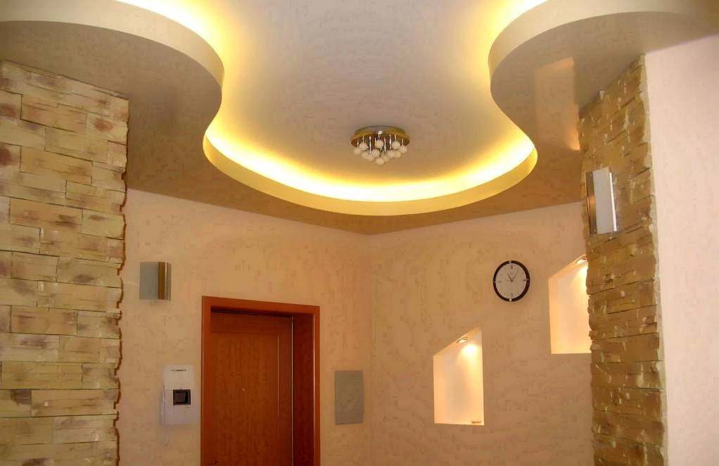 Натяжной потолок с плавными формами из гипсокартона в коридоре