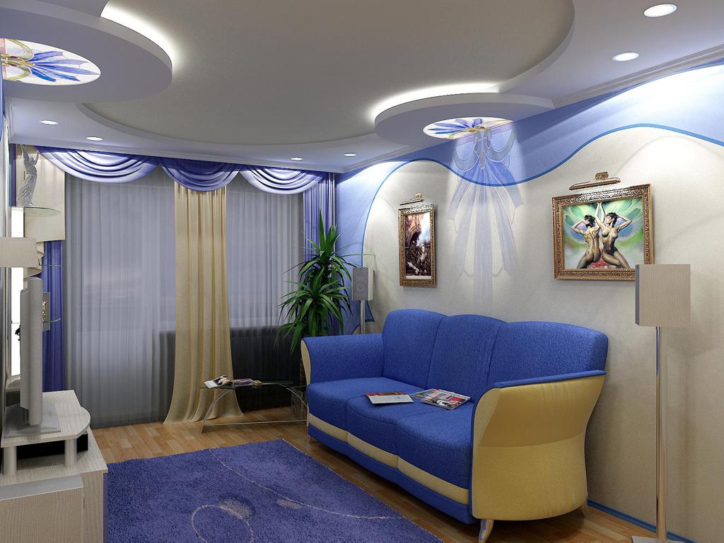 В гостиной интересно смотрятся многоуровневые натяжные потолки интересной формы