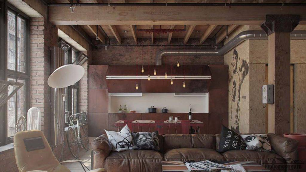 Интерьер в стиле лофт с деревянными конструкциями на потолке