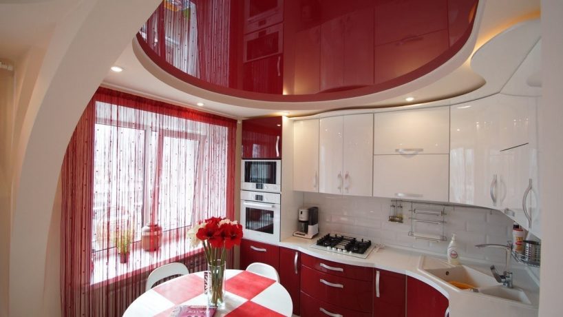 Кухня — это помещение, где натяжные потолки всегда будут уместнее любых других: на пленке не собирается конденсат, она не втягивает запахи, а в случае загрязнения ее можно просто аккуратно протереть мягкой губкой, смоченной в легком мыльном растворе или средстве для мытья окон.