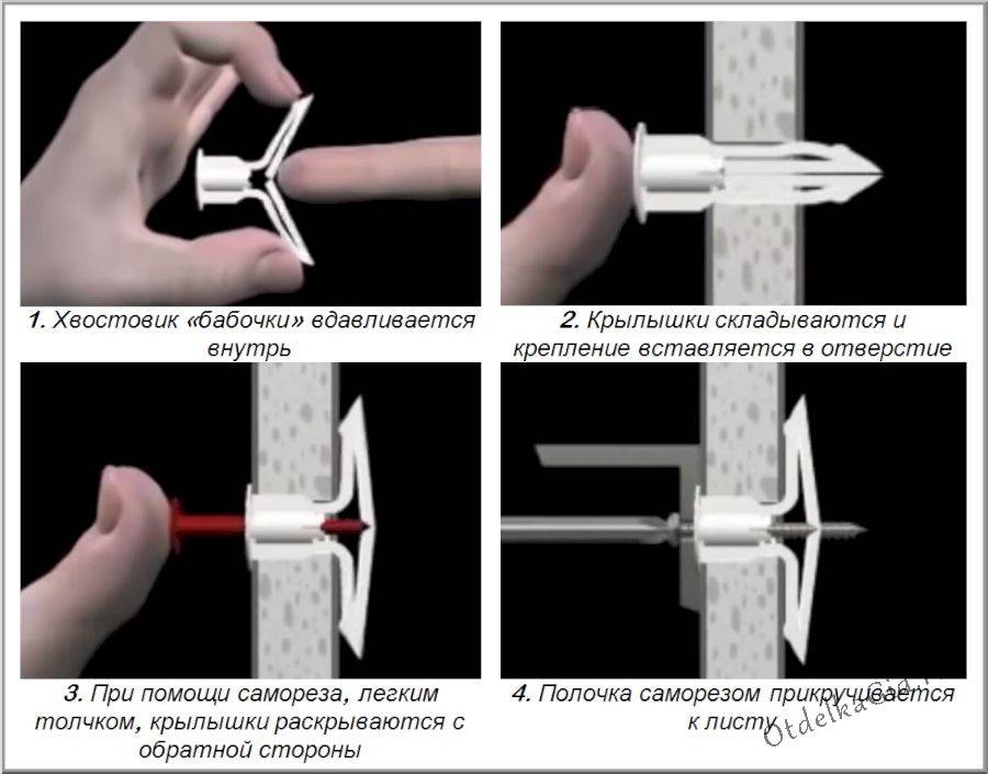 Когда рабочее пространство уже зашили гипсокартоном, не делали дополнительные укрепления, есть выход в виде специальной фурнитуры. Подойдут зонтики, бабочки, кнауф хартмут, моли дрива или легс.