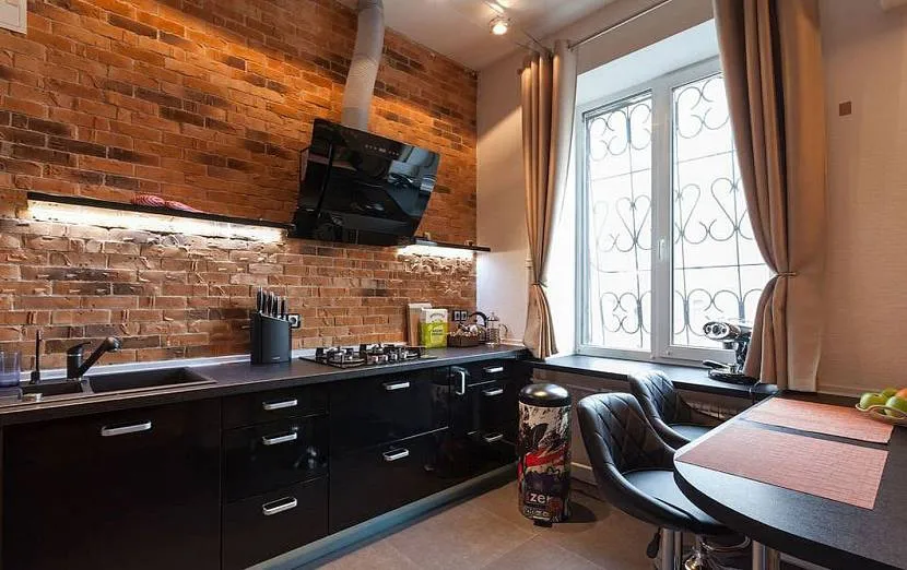 Если кухню 8 кв. оформили в нейтральных оттенках, то добавить сочности поможет древесная палитра. Тепло выглядит комната со светло-коричневыми полами и шоколадными фасадами гарнитура. Кирпичная кладка уместна в столовой зоне или при облицовке фартука. Универсальная гамма разбавит строгость черного и стерильность белого.
