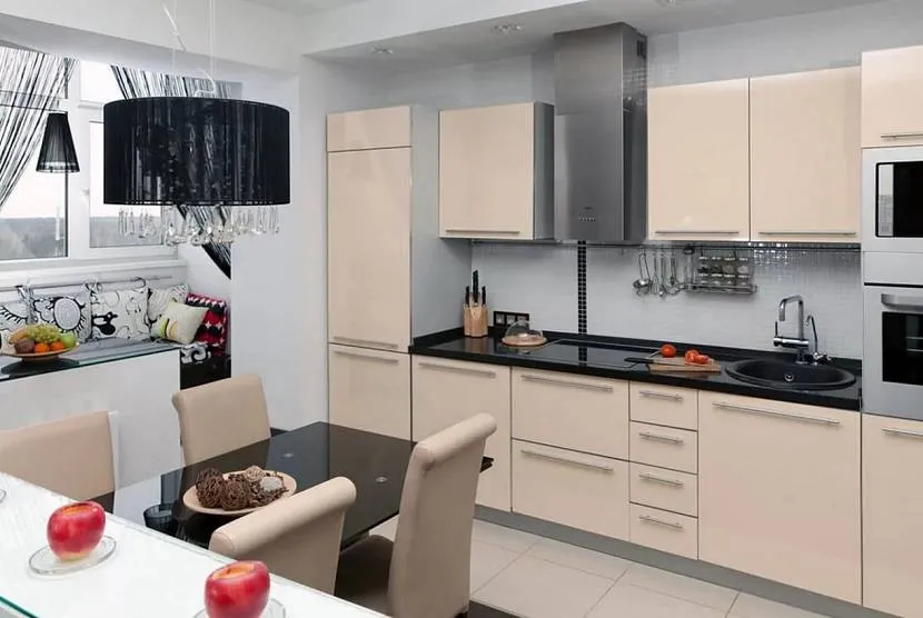 - Совмещение с лоджией. Если выход присутствует, помещение можно расширить путем объединения. Не придется убирать стену под подоконником. Вместо подоконника достаточно установить столешницу и использовать ее для хранения продуктов – хлебобулочных изделий и ваз с конфетами и вареньем. На лоджию зачастую выносят холодильник, что заметно экономит пространство. Если площадь лоджии позволяет, или он имеет форму квадрата, можно сделать обеденную зону. Иногда под оконными рамами лоджии делают оформление рабочей зоны.