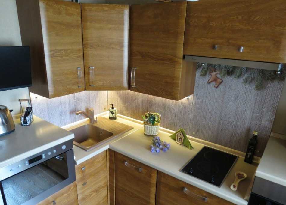Оригинально будет выглядеть мойка, встроенная в подоконник. Освещение можно создать при помощи светодиодной ленты. Поскольку помещение площадью 8 кв. метров небольшое, не стоит перегружать его дополнительными декоративными элементами. Достаточно сделать один яркий акцент, например, использовать необычный светильник на потолке.