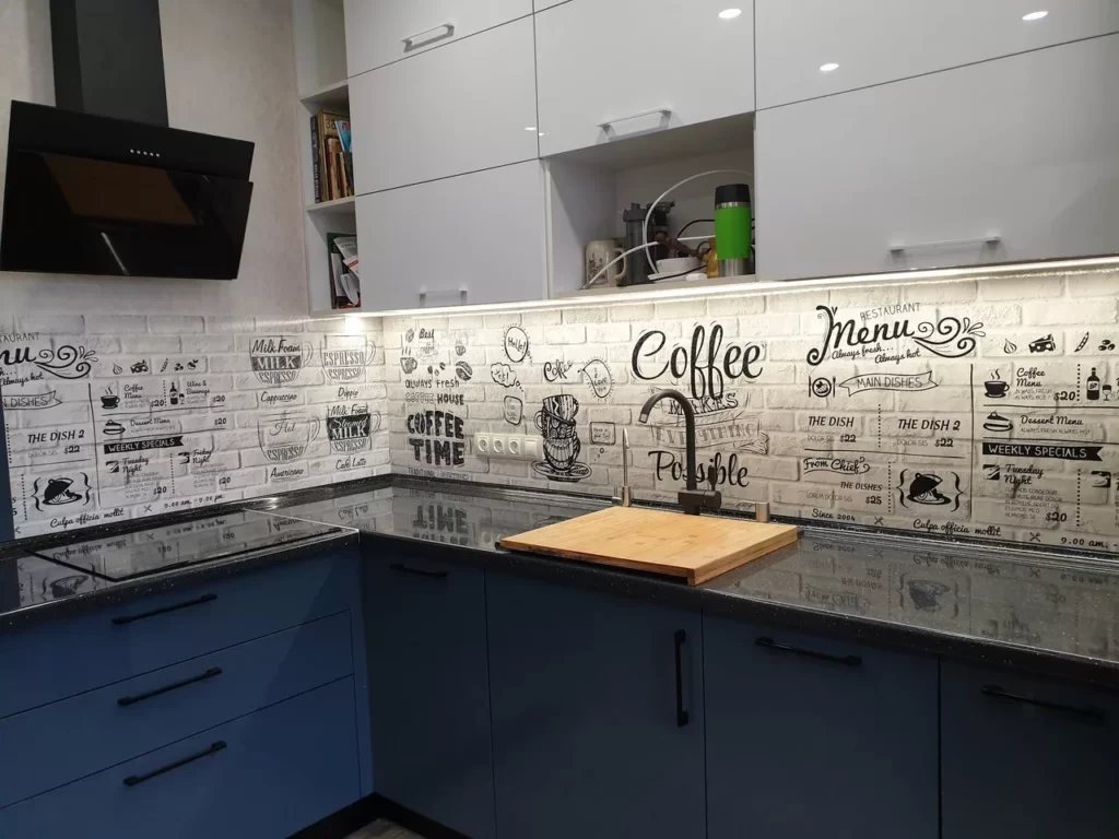 Поклейка не отличается от обычного процесса – выравнивают и грунтуют стену, после чего аккуратно совмещают части и разглаживают поверхность. Выдерживают необходимое для высыхания время, после чего наносят влагостойкую моющуюся краску. Впоследствии можно менять цвет хоть дважды в год, что очень удобно, ведь если будет заменена мебель, переделывать фартук не придется.
