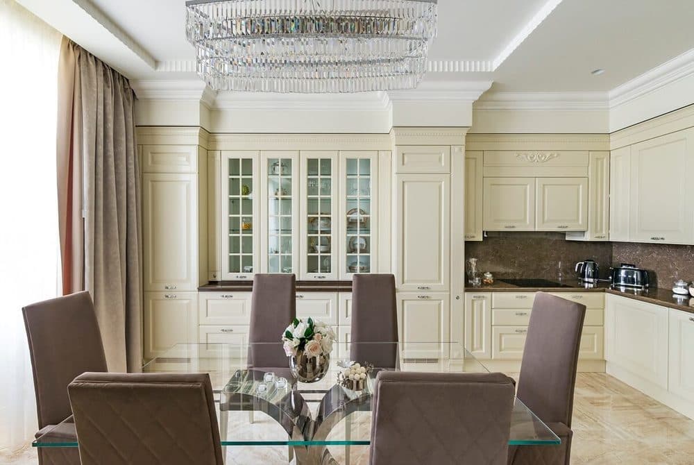 Кухню-столовую в стиле неоклассика не нужно обильно декорировать. Присутствуют различные виды украшений, которые выглядят роскошно и дорого. Здесь актуальны вазы (алебастровые, хрустальные) и ажурная скатерть из качественного текстиля. Посуда с нежными растительными узорами располагается на полке, а бокалы из стекла – в серванте.