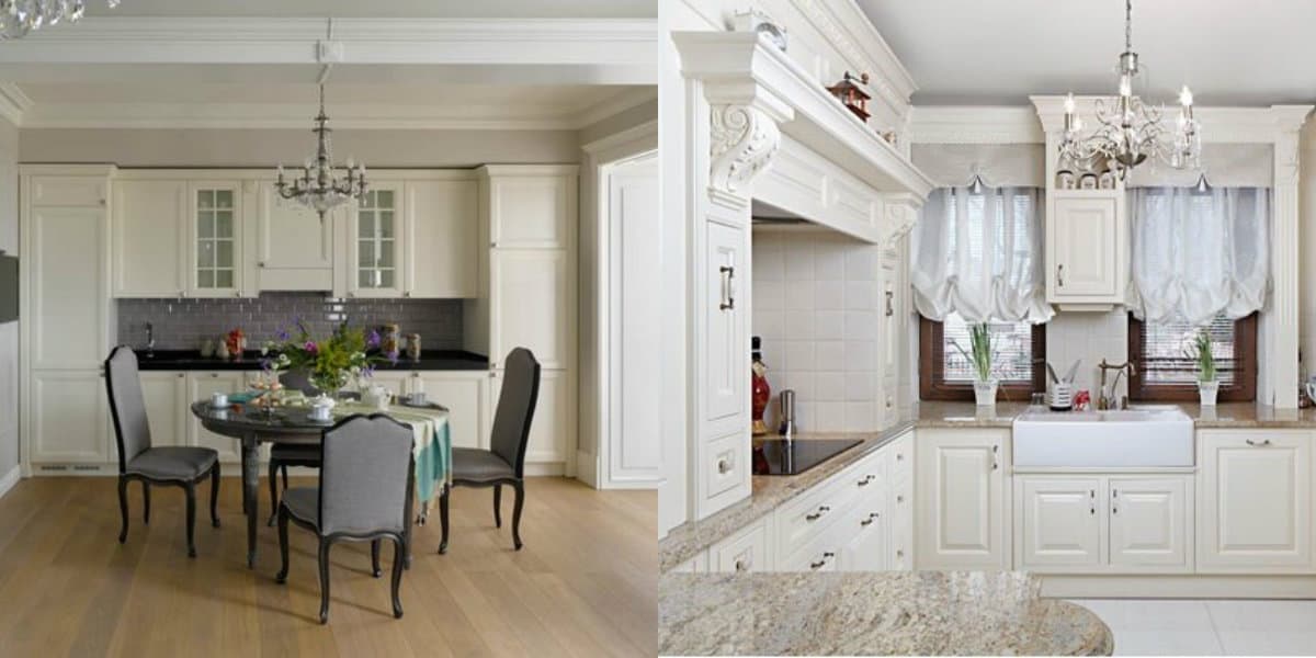 Белый, бежевый, слоновая кость — самые распространённые варианты и для мебели и для отделки на кухне в стиле неоклассика. Такой выбор полностью оправдан, хотя если бы не фото реальных интерьеров, аргументировать его право на жизнь было бы сложно (многим подавай яркое).