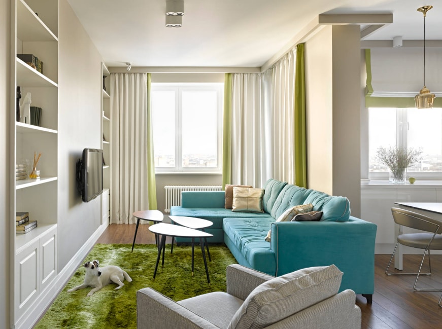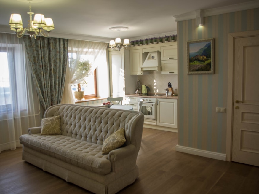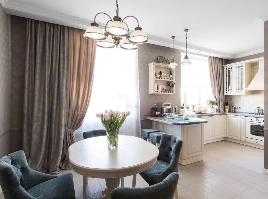 Границей между кухней и зоной отдыха могут служить легкие занавески или нитяные шторы, которые не утяжеляют пространство, но эффективно его разделяют.